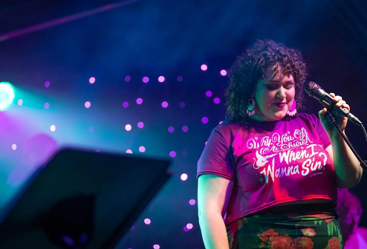 Full color mage includes a disco spaceship above the portrait of a curly-haired woman with a tear coming from her eye and creating a river. Clouds are in the sky, and surrounding her head are flowers and microphones and more.