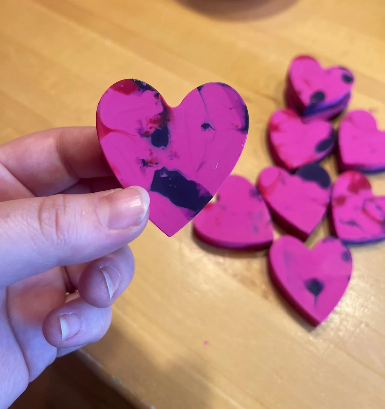 Pink/purple/red and other colored heart-shaped 2x2” wax crayon